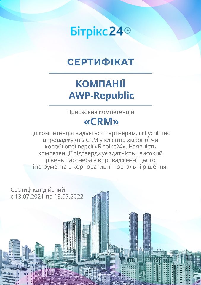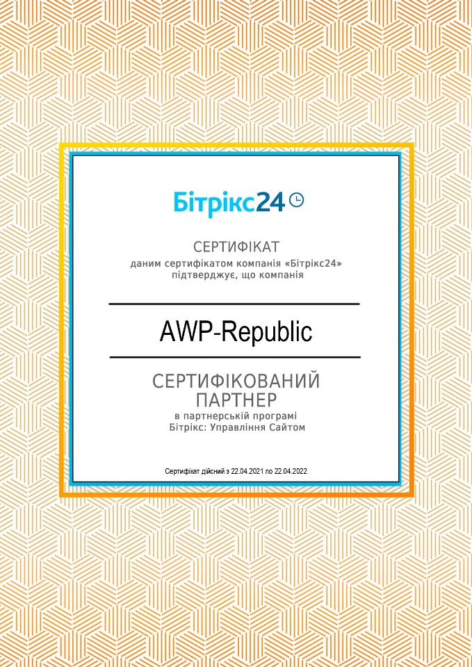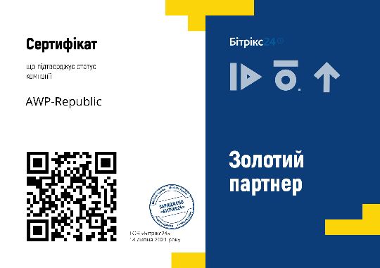 Студия AWP Republic является Золотым партнером Битрикс24 в партнерской программе "Битрикс24" и Сертифицированным партнером в партнерской программе "Битрикс: Управление сайтом". Наша компания обладает компетенциями "CRM", "Бизнес процессы", мы являемся участниками «Программы качества мониторинга внедрений". Мы предлагаем комплекс услуг в области системной интеграции, услуги по созданию и сопровождению сайтов, интернет-магазинов и корпоративных порталов на платформе Битрикс24.